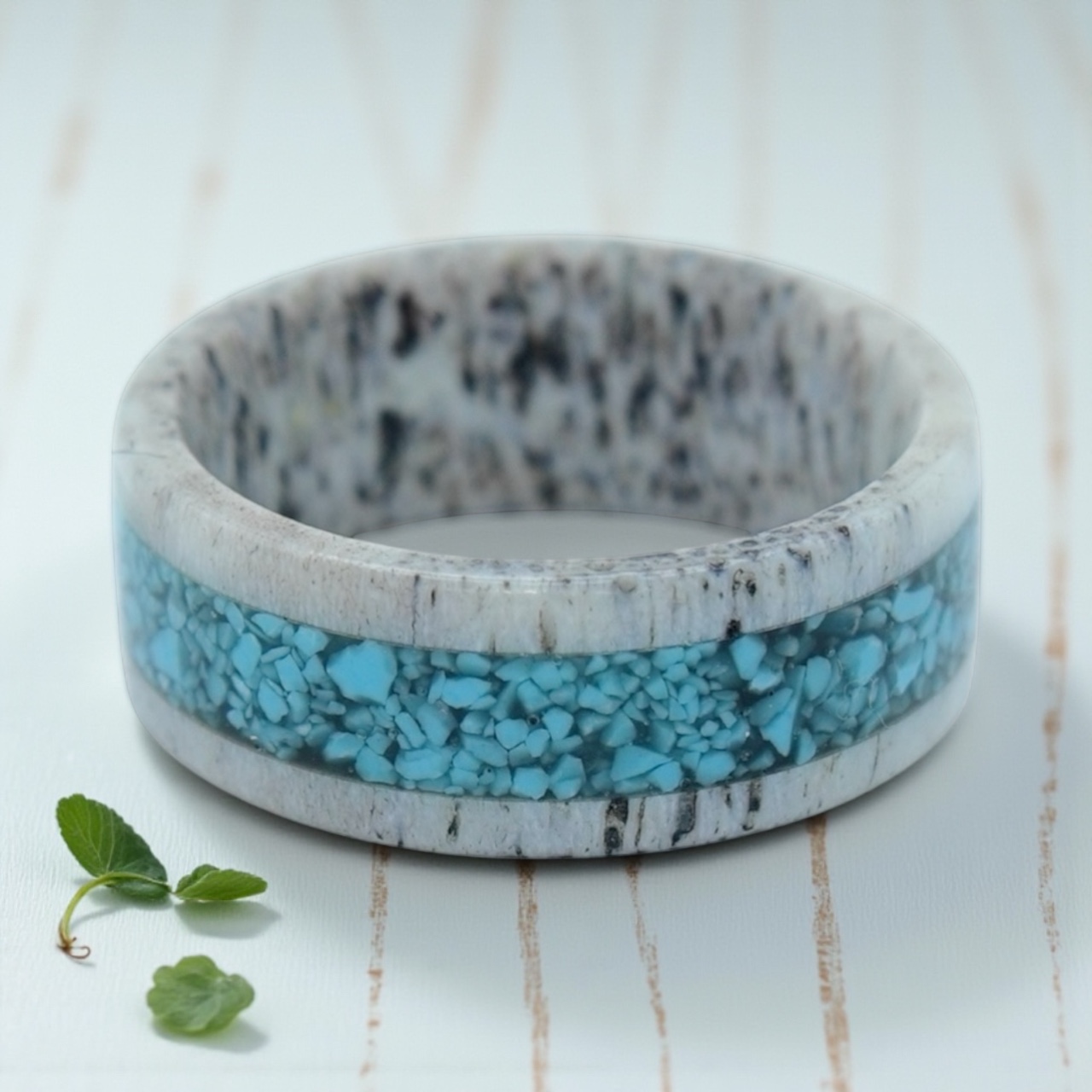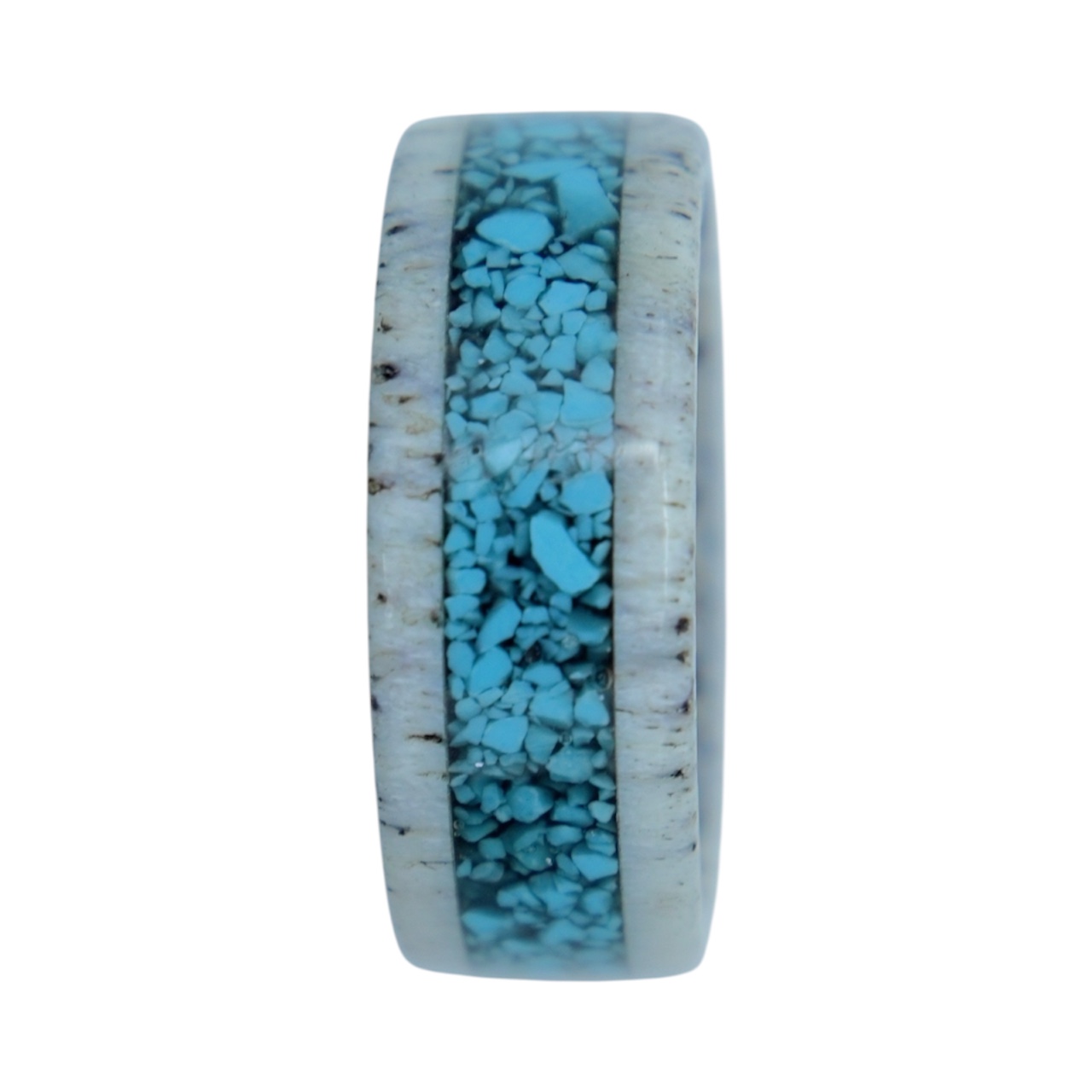 8mm Deer antler, domed ring with 4mm turquoise inlay. Polished finish.