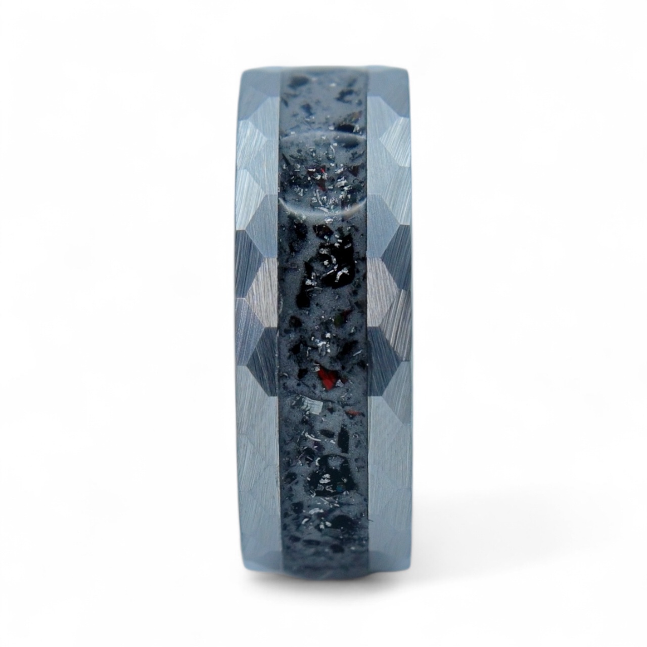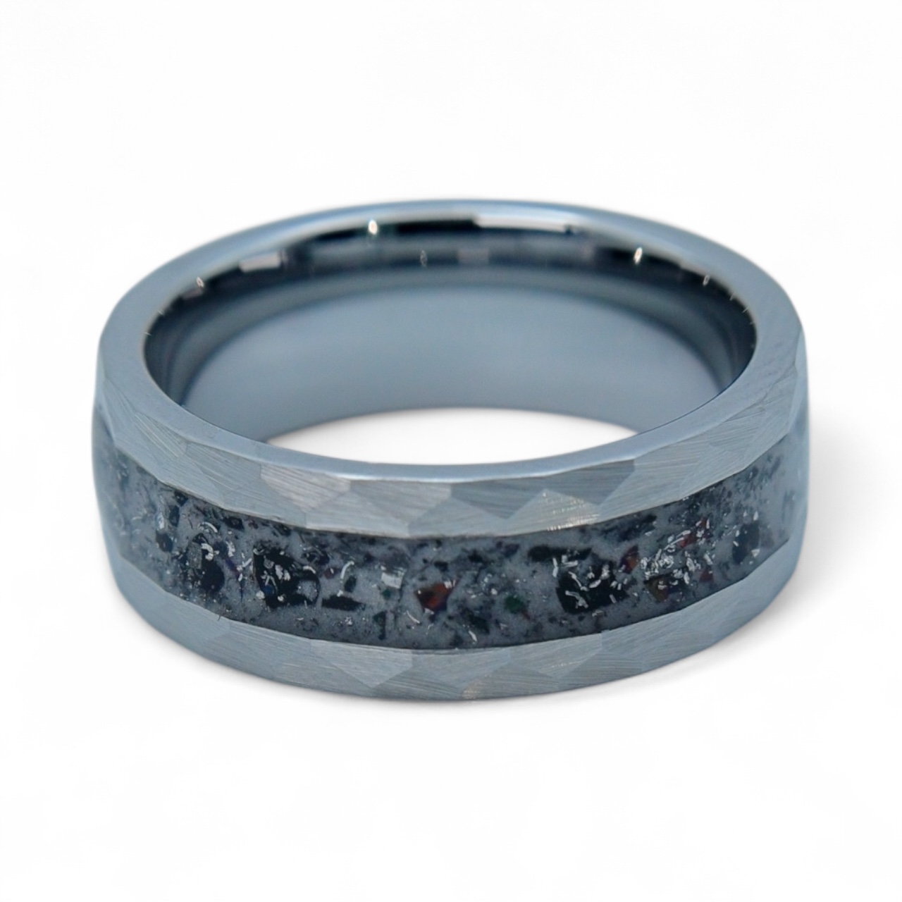 8mm Tungsten, domed ring, with 4mm crushed Shungite and Campo del Cielo Meteorite particles. Faceted finish.