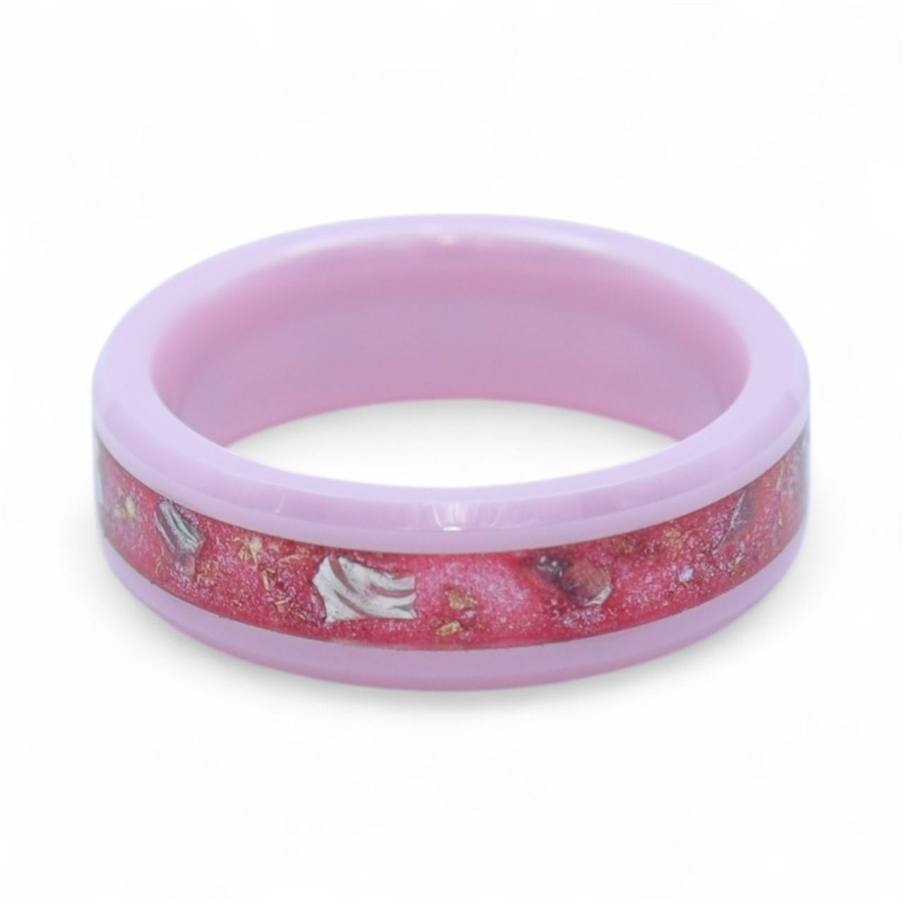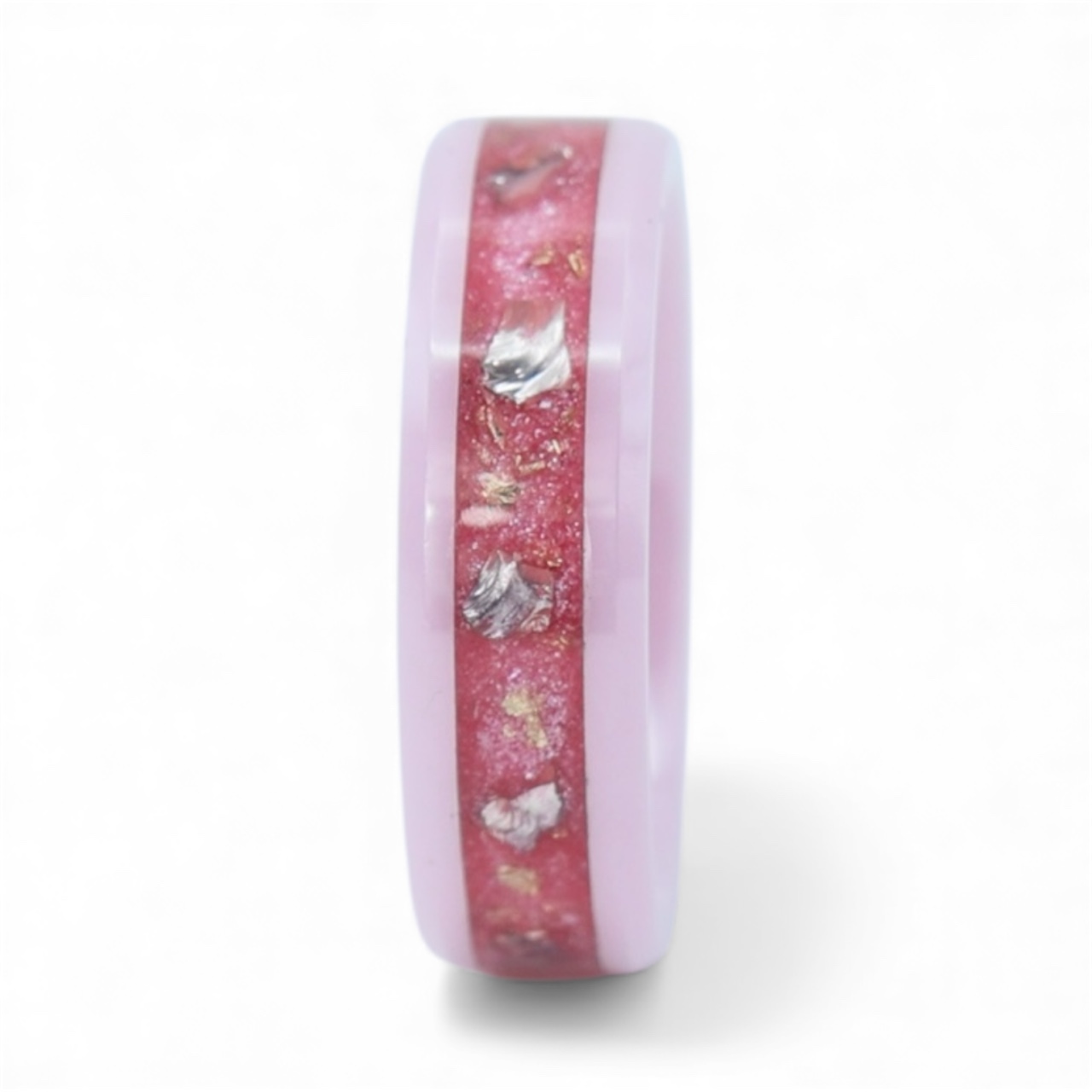 This unique ring is a soft, radiant celebration of color and light. Its pink ceramic core holds a glowing pink shimmer background, natural pink sea glass, and delicate gold leaf accents. Inspired by warm sunset beaches, this ring brings a dreamy, feminine energy to any look — perfect for those who love soft hues and ocean-inspired sparkle.