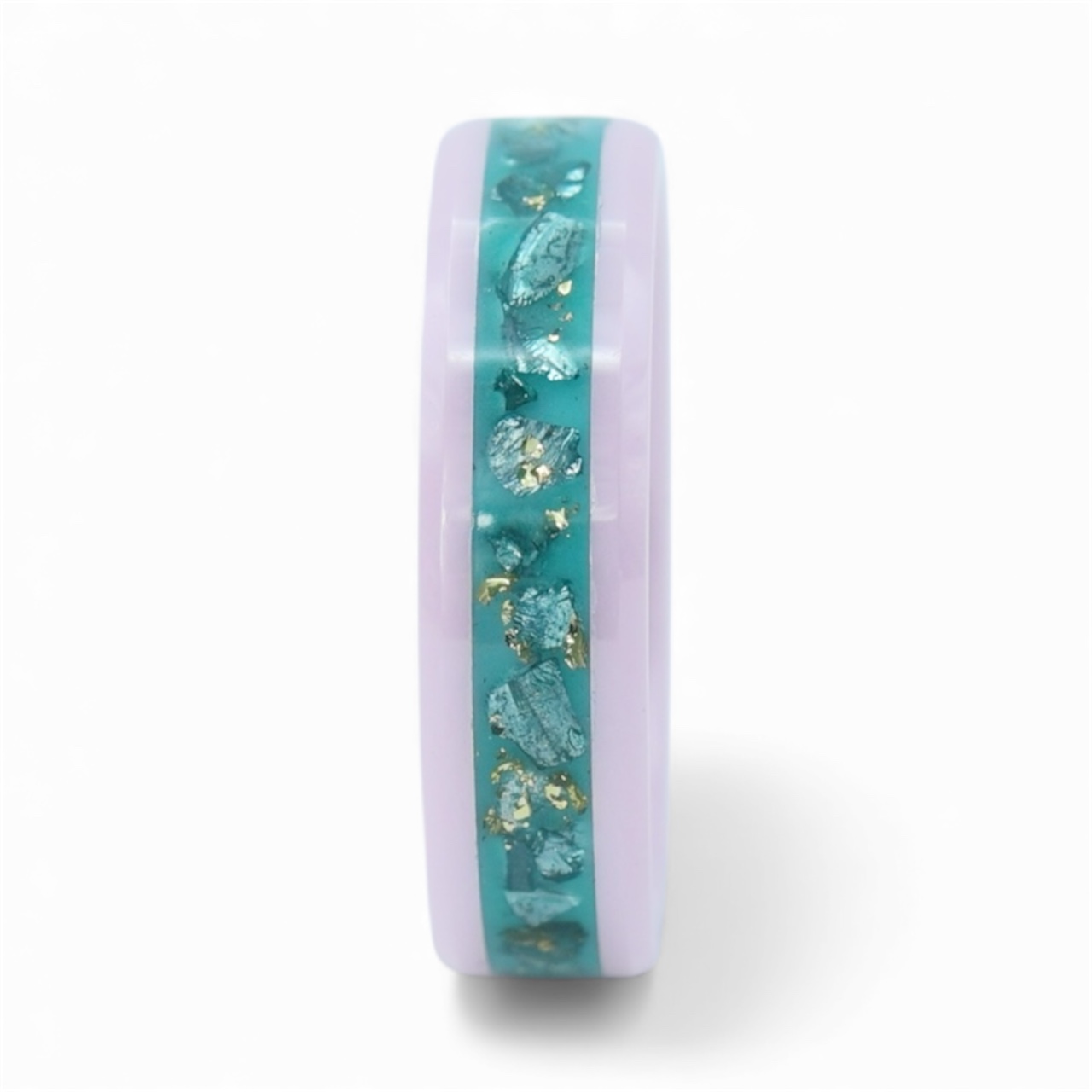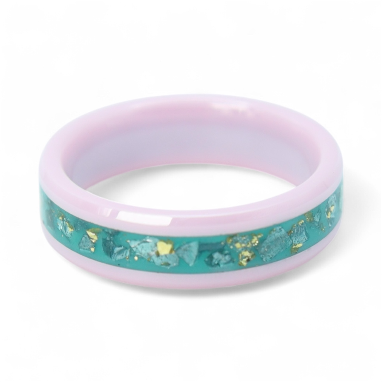 This ring blends vibrant coastal color with soft elegance. A pink ceramic core sets the stage for a shimmering teal background, teal sea glass pieces, and delicate gold leaf. This ring captures the movement of sunlit waves meeting warm shorelines, creating a bold yet graceful piece perfect for ocean lovers and color enthusiasts.