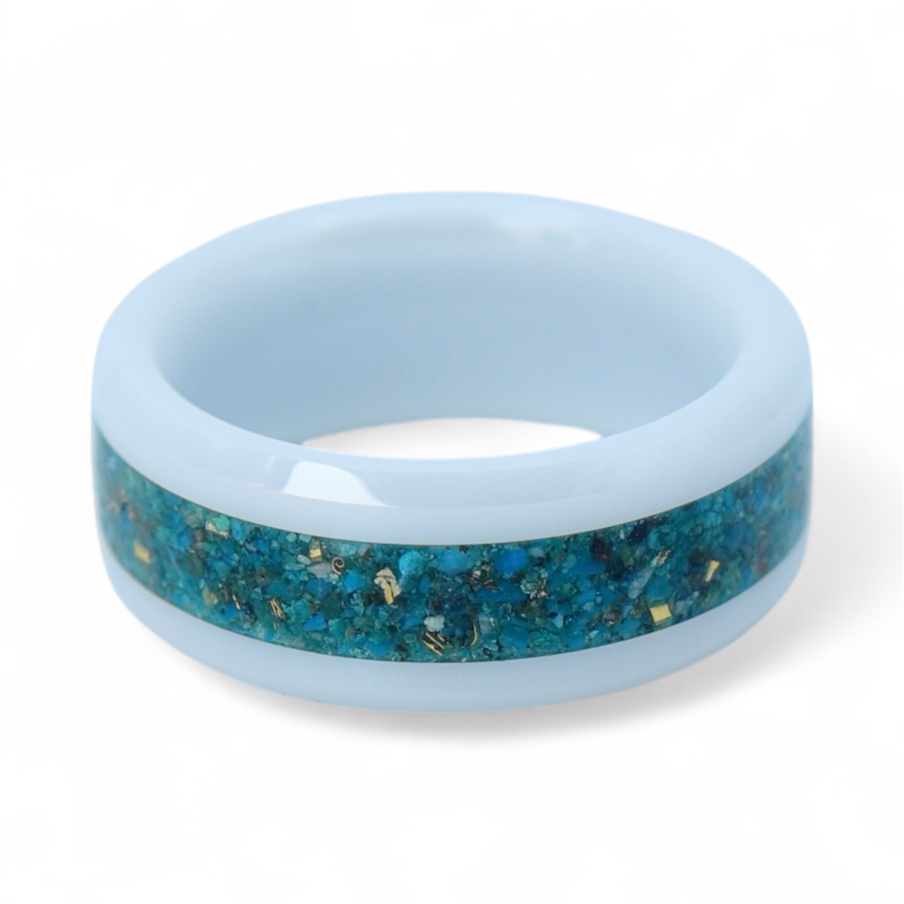 This white ceramic band blends crushed chrysocolla with shimmering brass accents, creating a ring that glows with rich teal tones and natural texture. A perfect choice for anyone drawn to vibrant, earthy elegance.