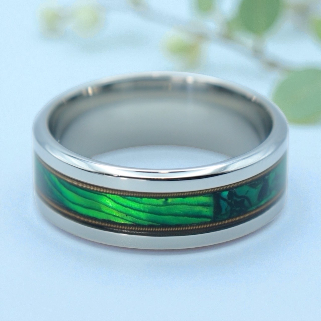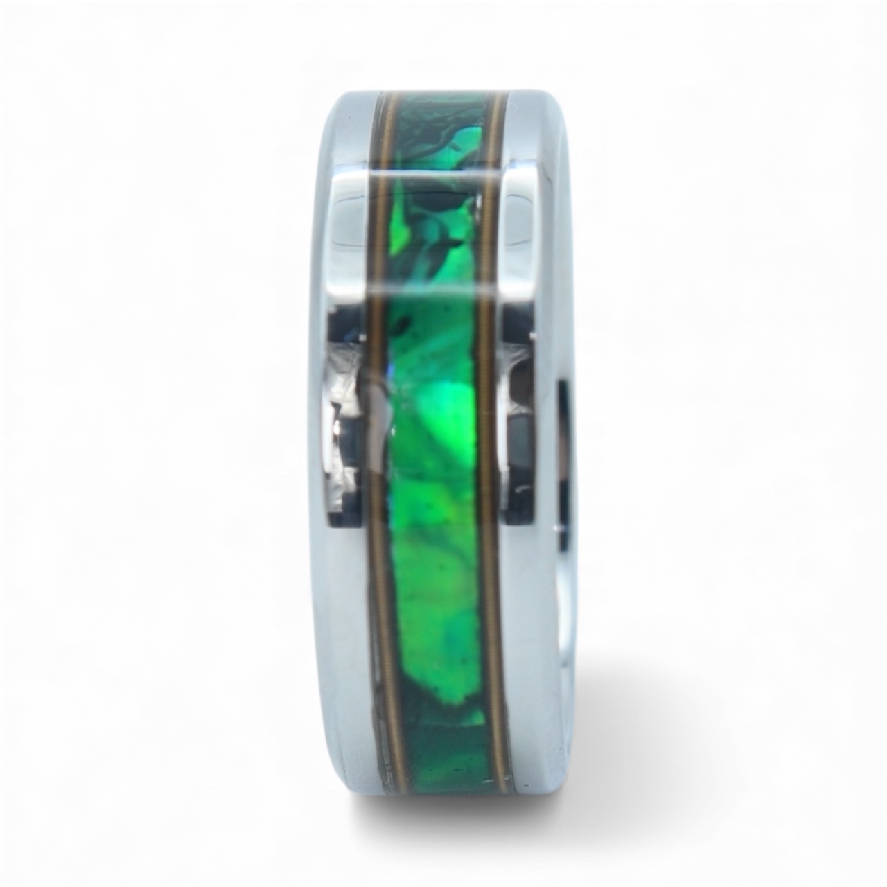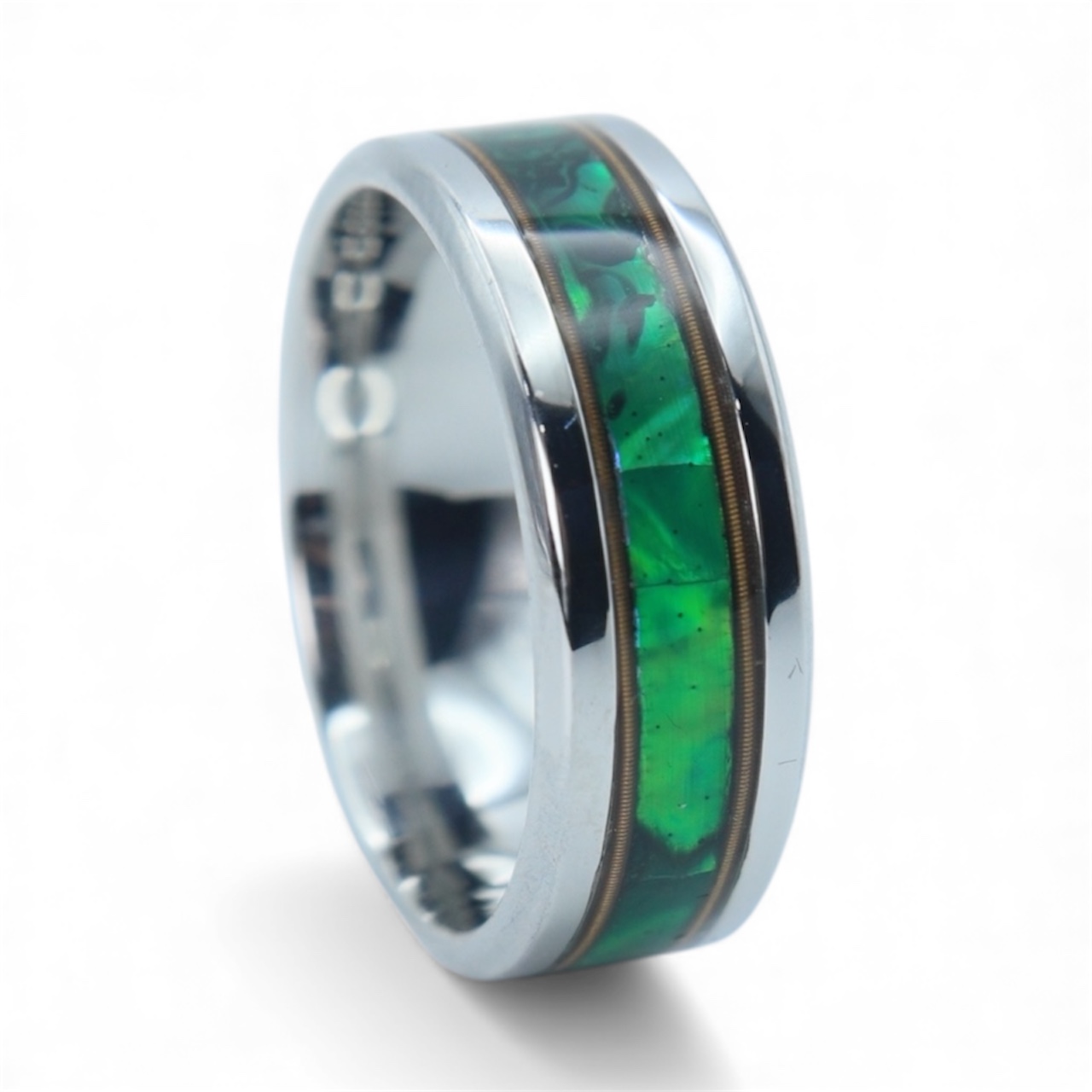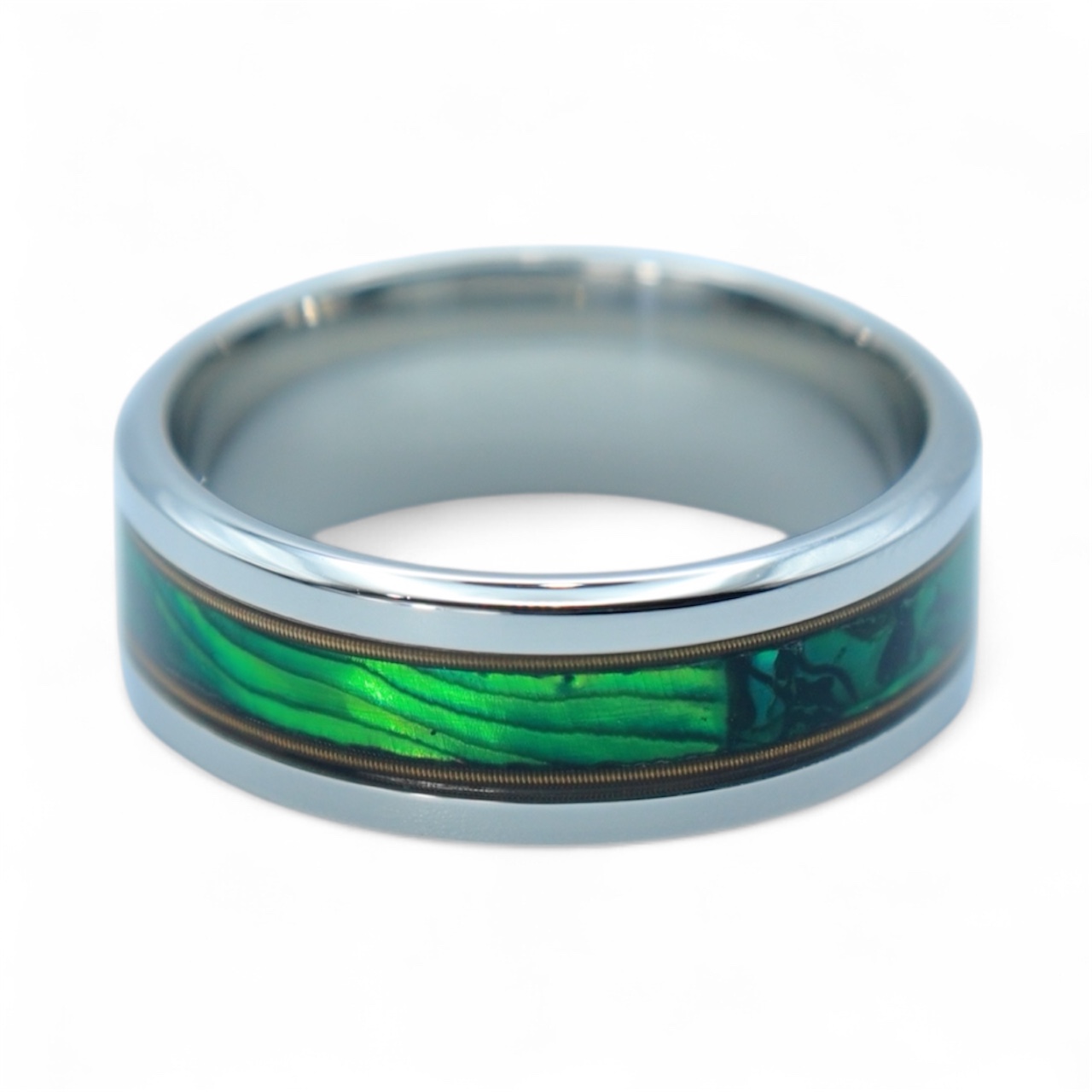 Radiant Chord brings music and color together in a bold titanium band. Brass guitar strings frame a center inlay of green New Zealand paua abalone, creating a vibrant contrast of gold, light, and iridescent ocean hues. Strong, modern, and full of rhythm — a ring made for the soul that shines from within.